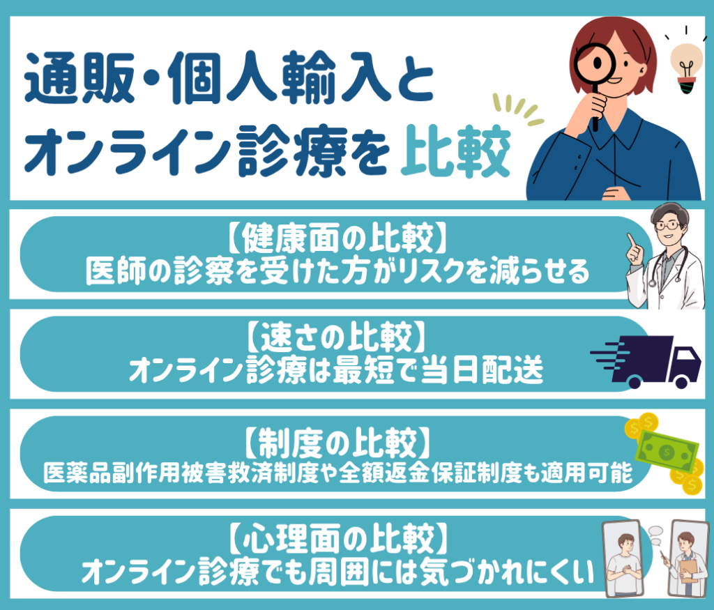 制度の比較では、オンライン診療で処方された国内承認薬であれば、医薬品副作用被害救済制度や全額返金保証制度も適用可能なケースがあります。