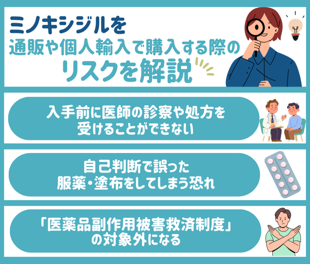 通販サイトや個人輸入を利用してミノキシジルを購入したい場合、リスクがあるのか気になる方も多いのではないでしょうか。