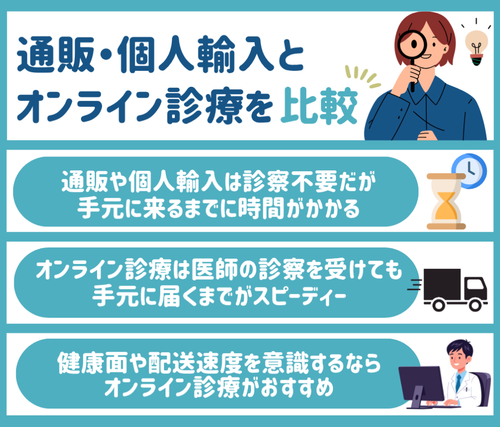そのため、通販や個人輸入を利用するよりもお薬が手元にスピーディーに届き、自宅にいながら受診ができるオンライン診療がおすすめです。