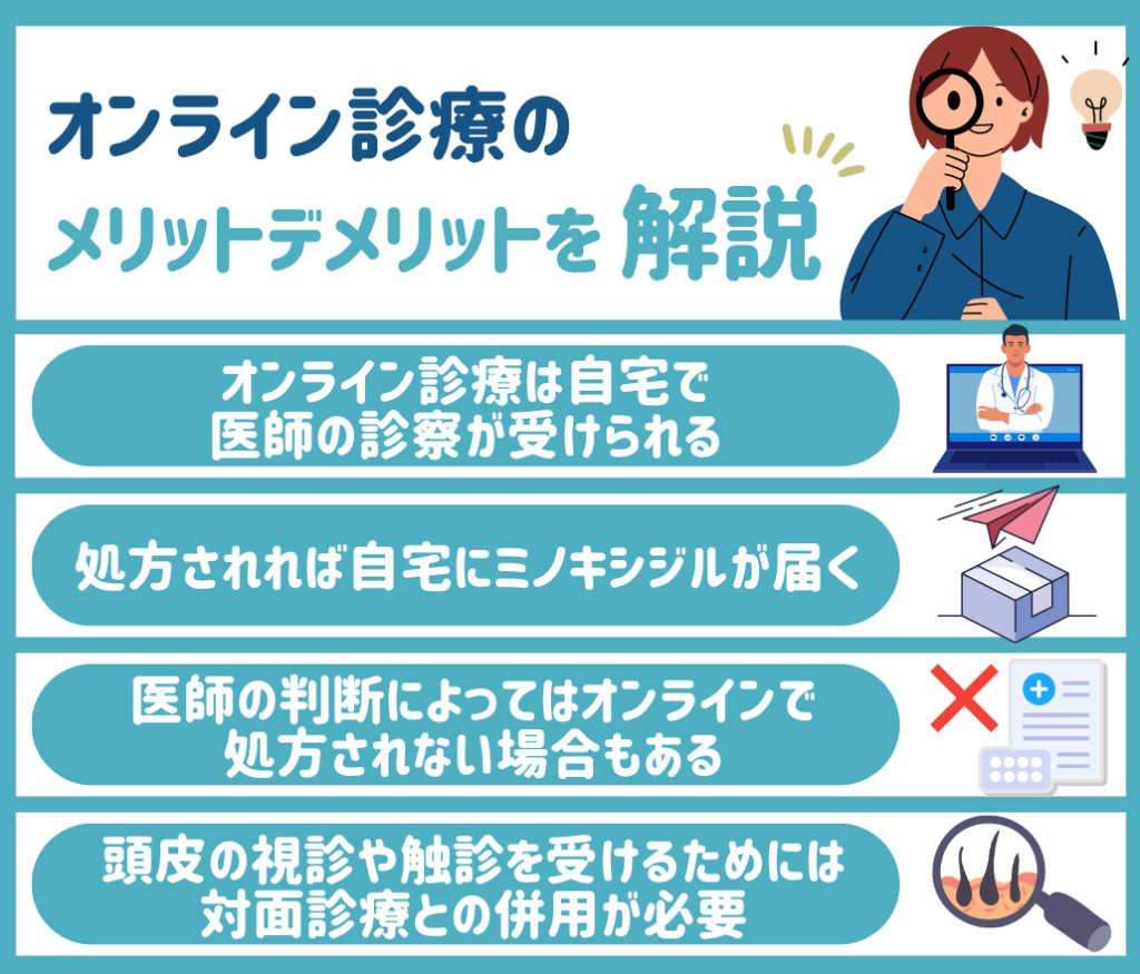 オンライン診療には、自宅で医師の診察が受けられるというメリットがありますが、医師の処方が下りなければミノキシジルを入手することができないというデメリットもあります。