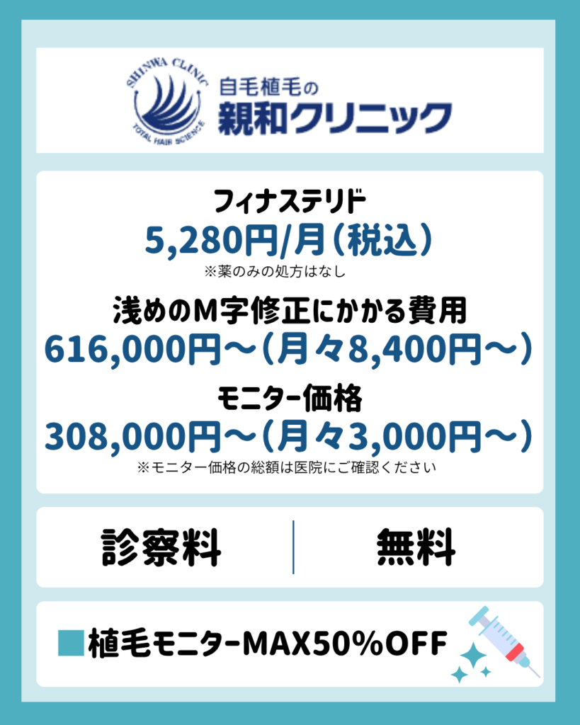 | 植毛料金 | 浅めのM字修正にかかる費用 616,000円~ (月々8,400円~) モニター価格 308,000円~ (月々3,000円~) ※分割払いでの例です。 モニター価格の総額は 医院にご確認ください |